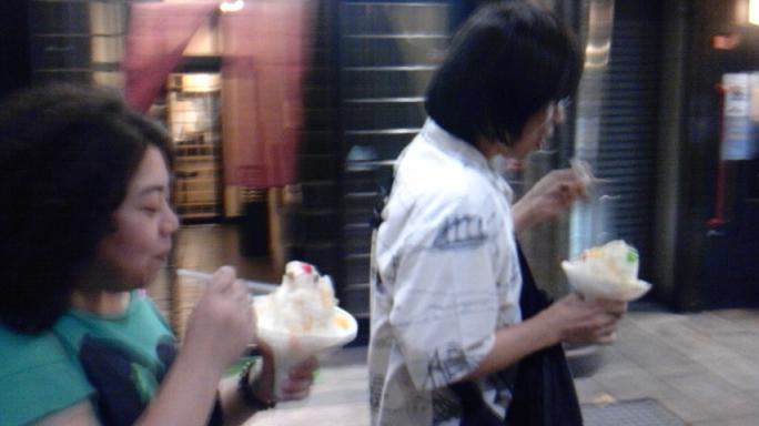 鹿児島名物「しろくま」を食べ歩くJON(犬)さんと田口さん。