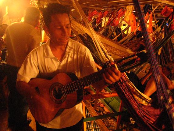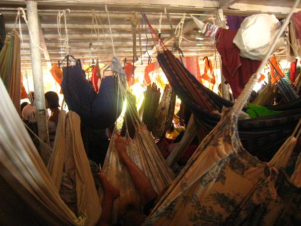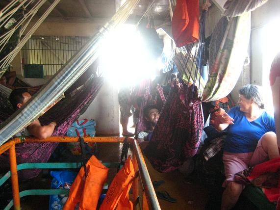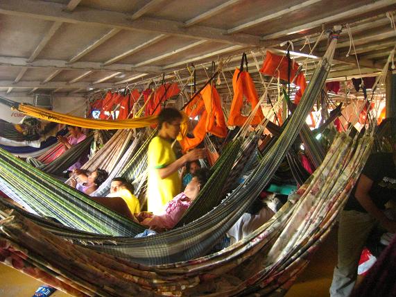 船内には座席がないので乗客はハンモックを吊るして寝泊りする。