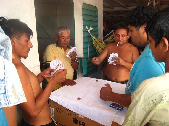 賭けトランプに興じる男達。