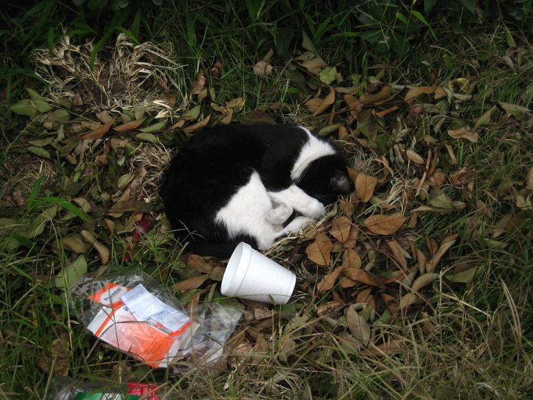 近所のスーパーへ買い物行く途中に2匹の野良猫がいる。
