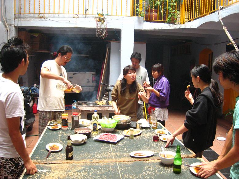 ペンションアミーゴの管理人さんに誘われ、宿の中庭でBBQ。