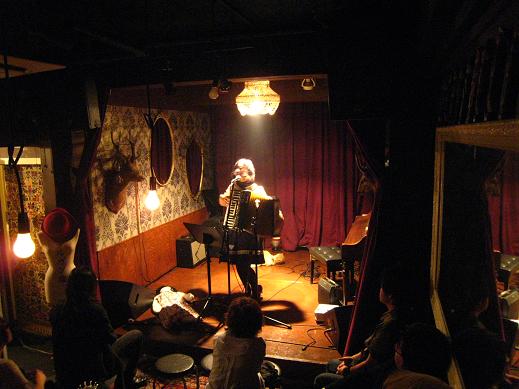 店内はイズミさんの趣味趣向が爆発したような絶妙な内装が凄い。イベント開始前からぞくぞくと集まってくるお客さんたち。あっという間に会場は満員。外国人の団体もチラホラ。すげえなぁ。のっこんの弾き語りで始まり、女装したタムラDUヒサシィさんの舞踏と続き、ゴトウイズミ+アコーディオンの演奏。イズミさんのライブ観るのは6・7年ぶりだ。以前よりもさらに絡みつくようにネットリ、シットリした声と即興による台詞が絶妙の世界を作り出す。観ているこちらの足元が不確かに揺らぐよう。イズミさんは幻影で、ヲルガン座は幻想で、おれは・・・と不思議な感覚に陥る。いかんいかん!本番に集中せねば!と楽屋に戻り水を一気に飲み干す。これで3本目。水飲みすぎて20分おきに尿意に襲われる。そして本番。ツアー最終日。一曲目「発情経由地獄行き」ではまだ掴み切れなかった空気も2曲目「8月のキャミソール」で一気に爆発する。最後の「動物大図鑑」ではジョージルーカスのネタで外人客が大爆笑してた。そして、アンコール。残る力を全て出し切って「忘れないで」を歌う。最高~。この瞬間を忘れられないからライブをやり続けているのだろう。緊張とストレスで胃腸が悪くなっても、プレッシャーに押しつぶされそうになっても、その苦労が一瞬で報われる。苦労したことすら忘れてしまう。だからまたくり返す。こりゃ麻薬ですね。麻薬だからいつかは身体がボロボロになって、やめる日が来るんかな。。