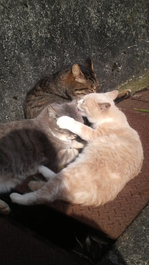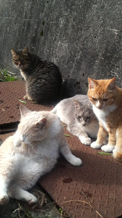 銀山へ向かう途中、仲良しの野良猫たちに遭遇。