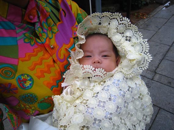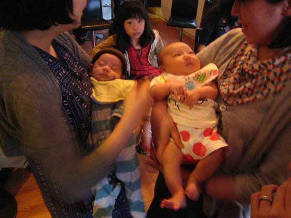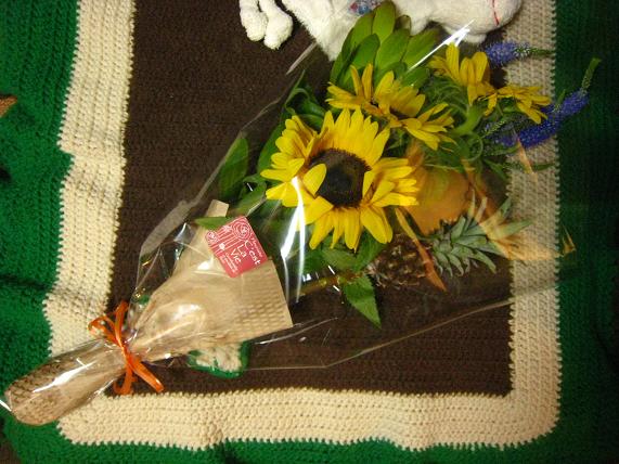 スーパーお母ちゃんから、新米お母ちゃんへ花束贈呈。