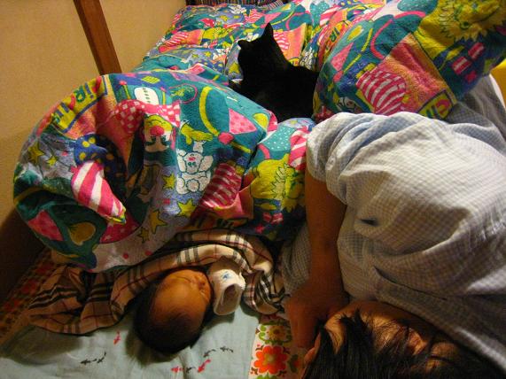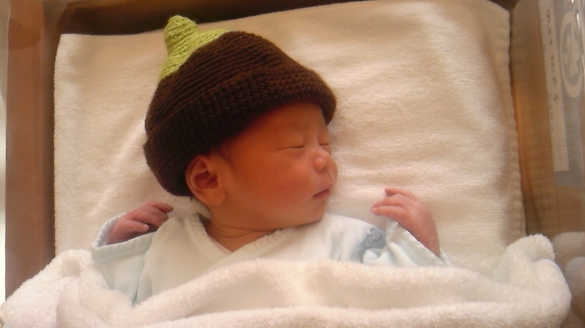 スヤスヤとよく眠る坊やに、奥さんが作った帽子をかぶせてみる。